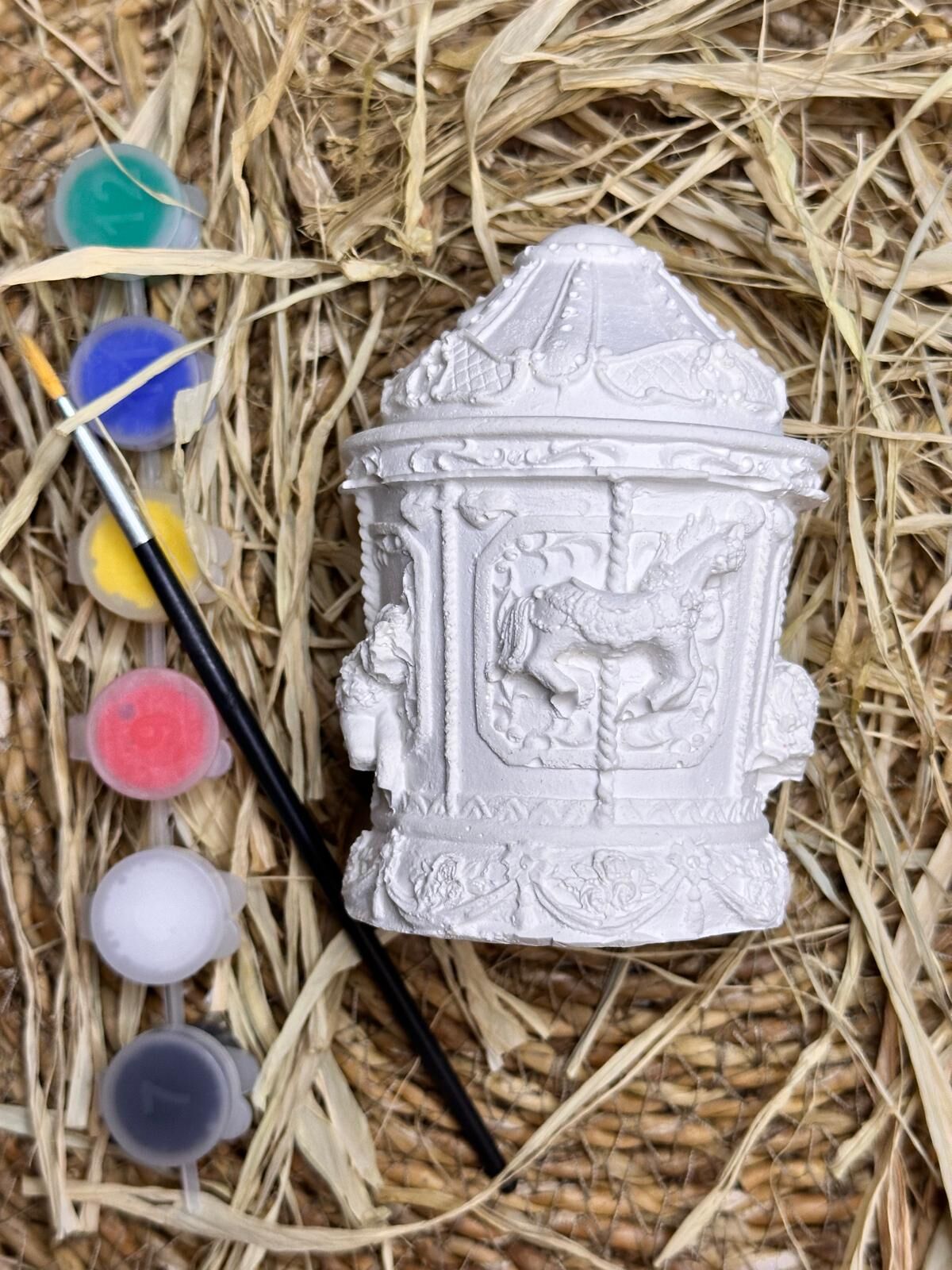 Atlıkarınca formundaki alçı figür, yanında gelen 6'lı boya ve fırçası ile birlikte.