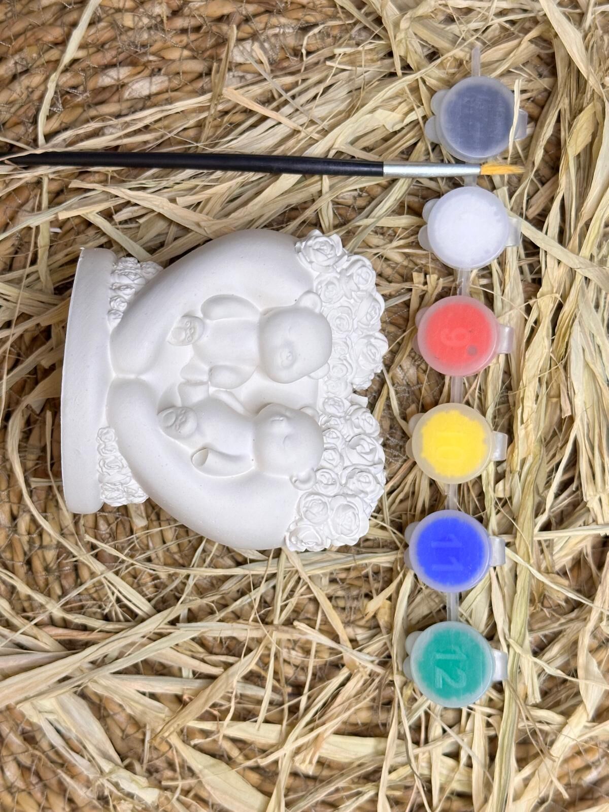 İçeriğinde 2 ayıcık figürlü alçı, 6 renk boya ve fırça ile birlikte gelir.